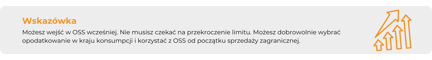 Dopóki nie przekroczysz tego progu, możesz co do zasady stosować polskie stawki VAT i rozliczać sprzedaż w Polsce, co znacząco upraszcza cały system. Nie jest to jednak jedyna możliwa ścieżka. Przepisy pozwalają na dobrowolne przejście na opodatkowanie w państwie konsumpcji, co oznacza, że możesz zdecydować się na stosowanie zagranicznych stawek VAT i korzystanie z OSS jeszcze przed przekroczeniem limitu. W praktyce niektóre firmy decydują się na taki krok wcześniej, żeby uniknąć późniejszego przejścia „w trakcie” rozwoju sprzedaży.