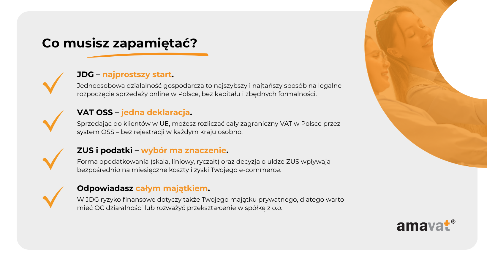 Na koniec – JDG pozwala rozwijać się stopniowo. Można zacząć od sprzedaży kilku produktów miesięcznie, testować rynek i dopiero z czasem skalować działalność. Gdy biznes się rozkręci, nic nie stoi na przeszkodzie, by przekształcić JDG w spółkę z o.o., co umożliwia Kodeks spółek handlowych w art. 551–584¹.