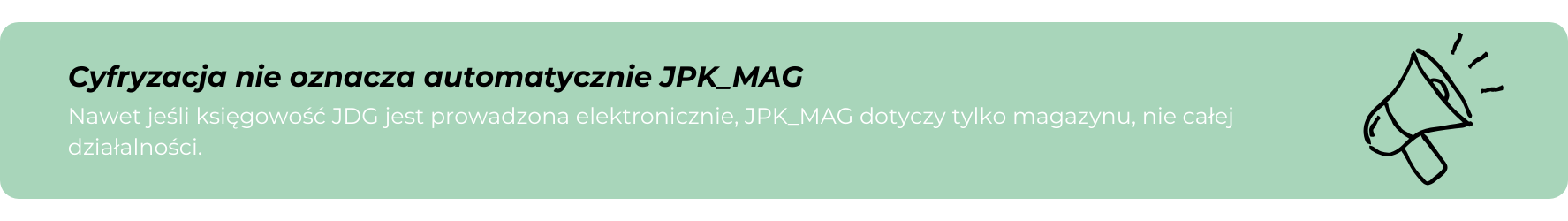 Dla e-commerce oznacza to, że księgowość JDG będzie coraz bardziej oparta na danych elektronicznych. Warto jednak jasno podkreślić, że większa cyfryzacja nie oznacza automatycznie obowiązku JPK_MAG. Ten plik nadal dotyczy wyłącznie sytuacji, w których istnieje elektroniczna gospodarka magazynowa, czyli zapisane cyfrowo ruchy i dokumenty magazynowe.