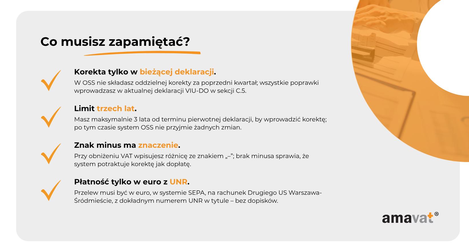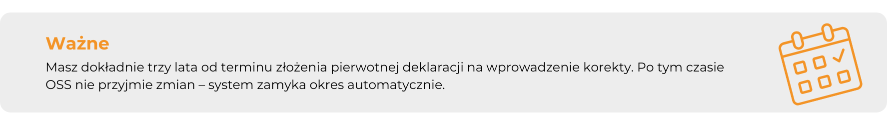 Po tym dniu korekta w ramach OSS nie jest już możliwa — system nie przyjmie zmian w deklaracji. Wynika to zarówno z polskich przepisów, jak i z unijnych wytycznych Komisji Europejskiej, które wprowadzają jednolity limit czasowy dla całej UE.