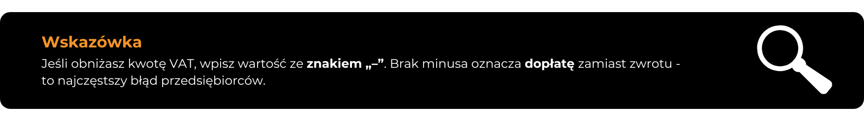 – oraz kwotę różnicy VAT (z minusem przy zmniejszeniu, dodatnio przy zwiększeniu).