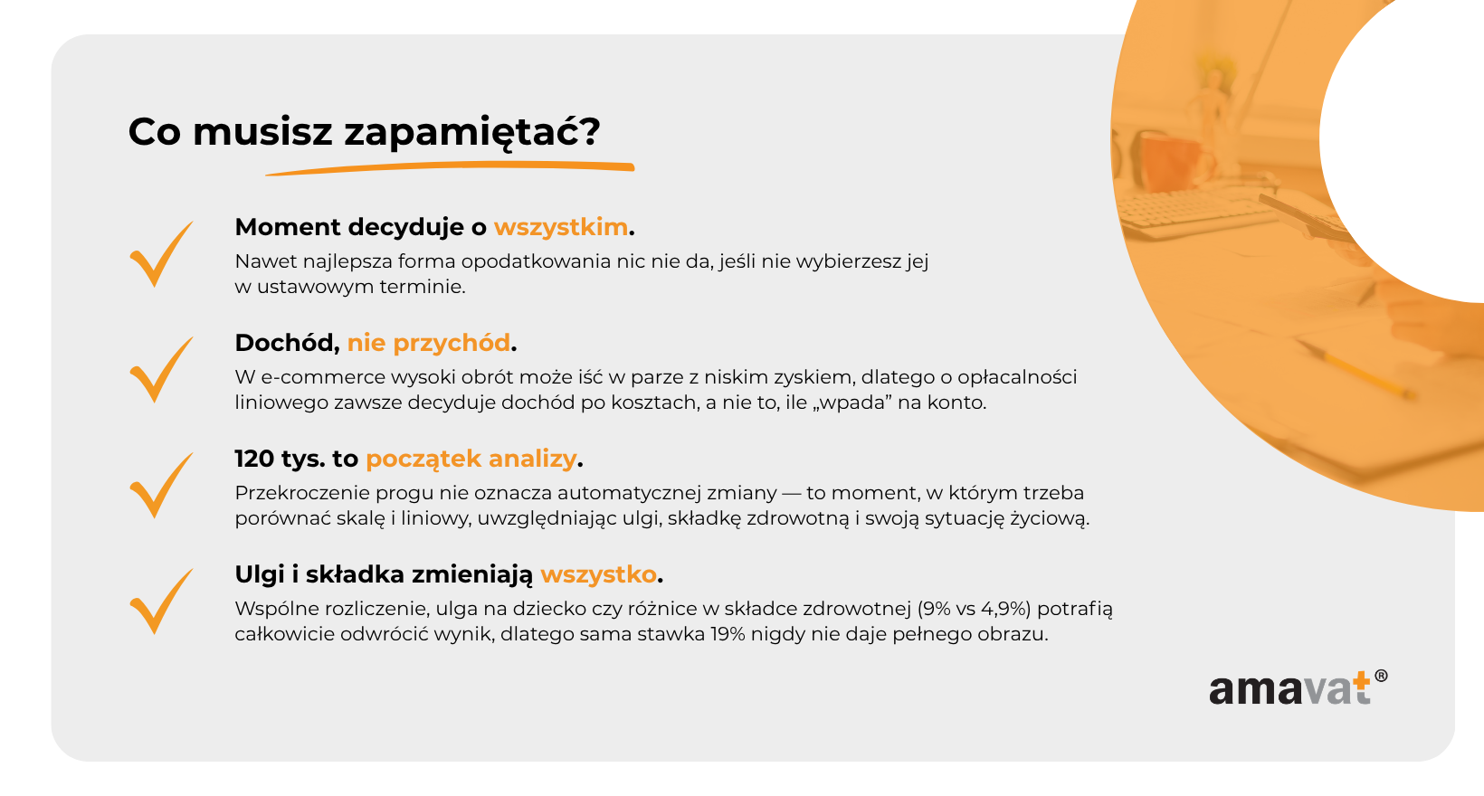 Warto też pamiętać, że to wszystko dzieje się w kontekście Twojego biznesu, a nie w oderwaniu od niego. E-commerce rzadko jest liniowy. Są skoki sprzedaży, sezonowość, zmiany w kosztach reklamy, nowe kanały sprzedaży. Dlatego decyzja o przejściu na podatek liniowy nie powinna być reakcją na jeden dobry miesiąc czy chwilowy wzrost, tylko efektem świadomej oceny całego roku i prognoz na kolejny.