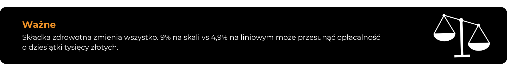 To jest moment, w którym decyzja o zmianie formy opodatkowania powinna być podejmowana świadomie, na podstawie danych, a nie przeczucia. Analiza powinna obejmować nie tylko sam dochód, ale też dostępne ulgi oraz różnice w składce zdrowotnej między skalą a podatkiem liniowym. Przy skali wynosi ona co do zasady 9% dochodu, a przy liniowym 4,9%, z ograniczeniem w rozliczeniu do określonego limitu. Ta różnica potrafi realnie wpłynąć na opłacalność i przesunąć moment, w którym liniowy zaczyna mieć sens.