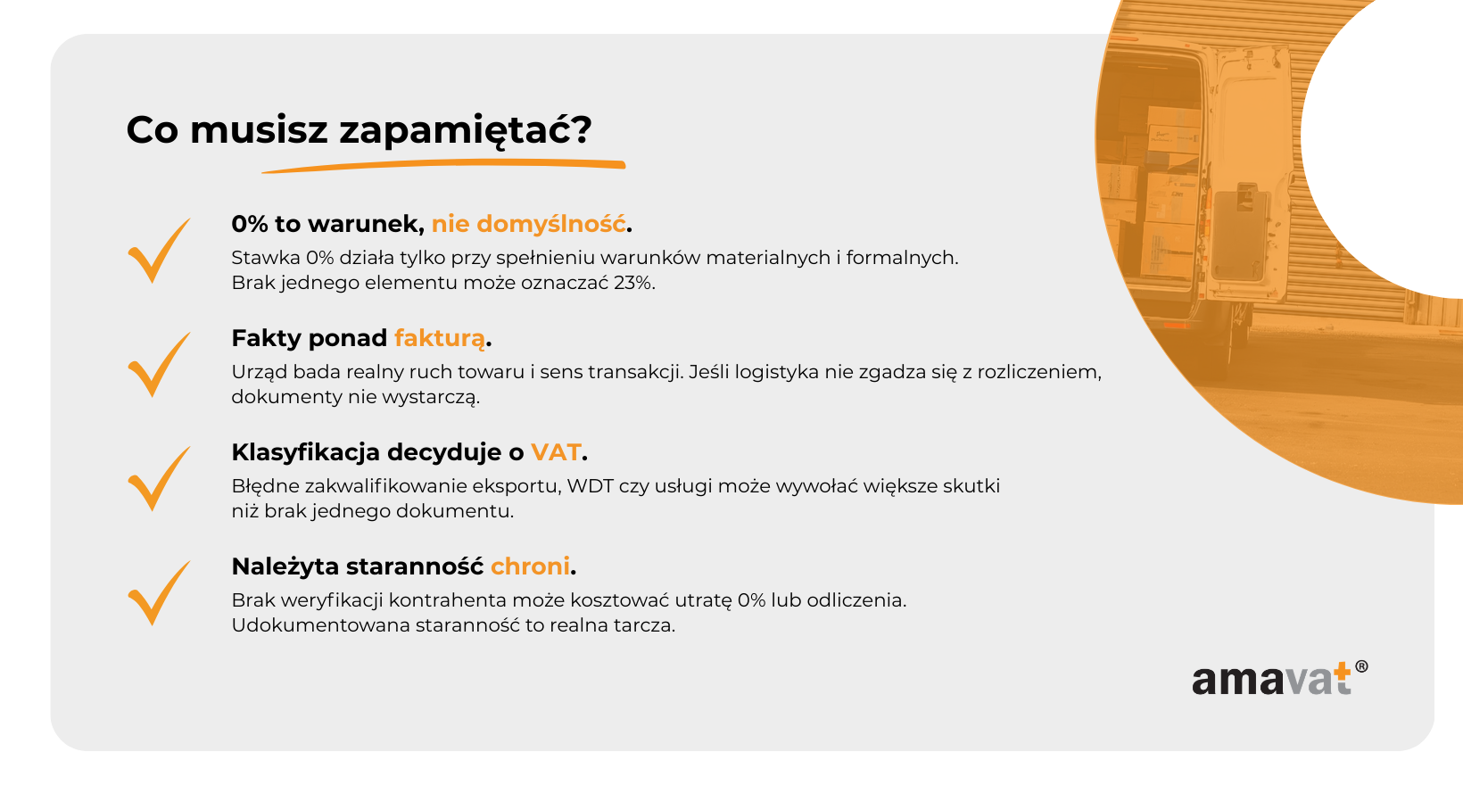 Dlatego uchybienia czysto formalne, o ile nie dotyczą elementów uznanych obecnie za warunki materialne, nie powinny automatycznie prowadzić do utraty prawa do 0%. Natomiast brak rzeczywistego przemieszczenia towaru, brak aktywnego numeru VAT UE nabywcy czy brak raportowania w VAT-UE to już nie są drobiazgi techniczne.