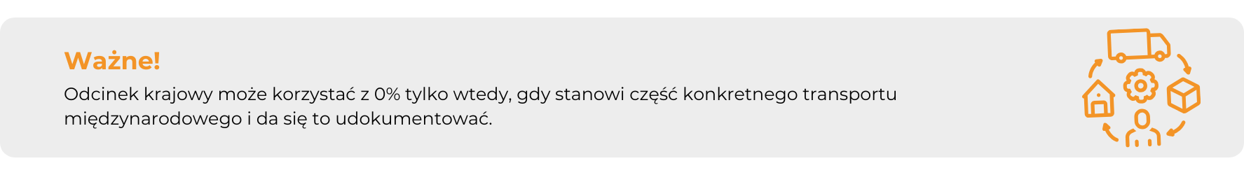 Częstym problemem są tzw. odcinki krajowe. Transport międzynarodowy bywa realizowany etapami przez różnych przewoźników. Polska firma może wykonywać tylko odcinek na terytorium kraju. Zastosowanie 0% dla takiego odcinka jest możliwe wyłącznie wtedy, gdy stanowi on część konkretnego transportu międzynarodowego w rozumieniu ustawy i da się to jednoznacznie wykazać dokumentami wymaganymi w art. 83 ust. 5.