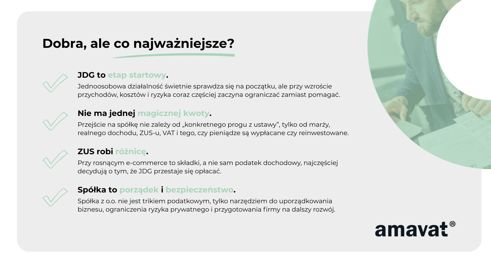 To jest moment, w którym różnica między JDG a spółką z o.o. przestaje być teorią.