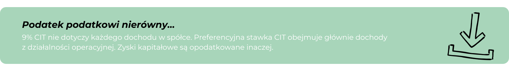 Warto jednak doprecyzować dwie ważne rzeczy. Po pierwsze, 9% CIT dotyczy wyłącznie dochodów z działalności operacyjnej, czyli w praktyce typowej sprzedaży towarów lub usług. Nie obejmuje na przykład zysków kapitałowych, takich jak dywidendy otrzymane przez spółkę czy sprzedaż udziałów, które są opodatkowane według stawki 19%.