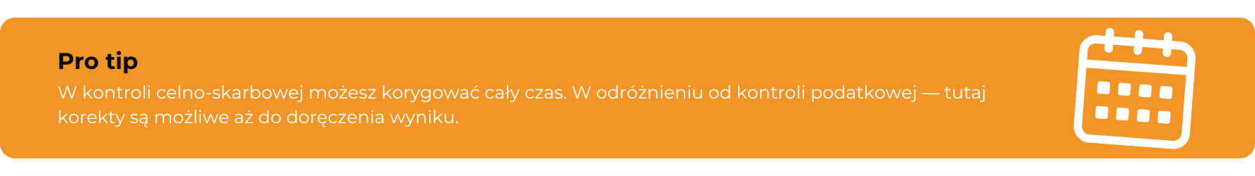 Kontrola celno-skarbowa wygląda z pozoru podobnie, ale procedury rządzące korektami są tu zupełnie inne. Po pierwsze, doręczenie upoważnienia do przeprowadzenia kontroli uruchamia szczególny, czternastodniowy okres, w którym przedsiębiorca może jeszcze szybko uporządkować deklaracje, zanim kontrola faktycznie się rozpocznie. Jeśli kontrolujący nie wykonali jeszcze pierwszej czynności, te dwa tygodnie pozwalają w praktyce zapobiec późniejszym problemom — szczególnie gdy przedsiębiorca wie, że rozliczenia wymagają korekt.