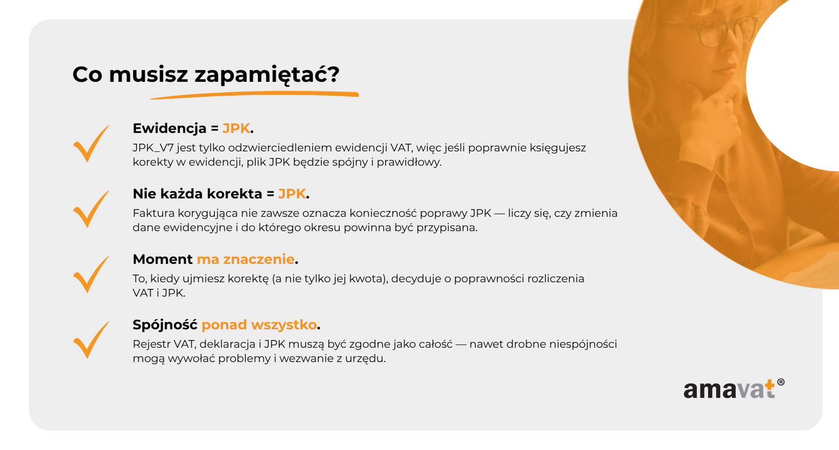 Z punktu widzenia JPK oznacza to jedno: nie kierujesz się tym, że coś „zwiększa VAT”, tylko tym, dlaczego to się zmieniło i do którego okresu należy przypisać tę zmianę zgodnie z przepisami.