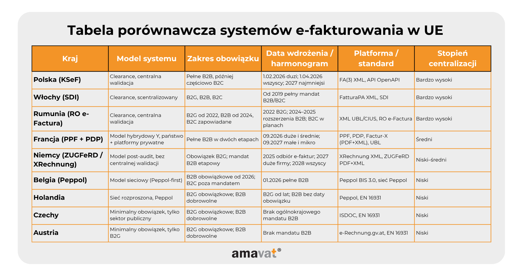 Warto jednak zaznaczyć, że Rumunia, mimo że już korzysta z systemu clearance, jest w trakcie domykania pełnego obowiązku. B2G jest tam obowiązkowe od 2022 roku, B2B zostało szerzej objęte systemem od 2024 roku, a B2C ma wejść od 2025. Innymi słowy: model jest już scentralizowany, ale zakres obowiązku nadal się rozszerza.