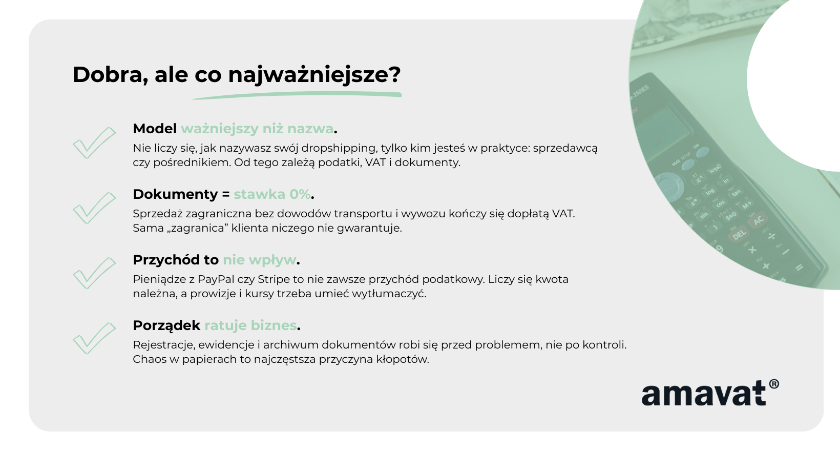 Na koniec warto podkreślić jedno. Dobra księgowość ecommerce w JDG nie polega na tym, że nigdy nie popełnisz błędu. Polega na tym, że masz komplet dokumentów, spójny model działania i jesteś w stanie wytłumaczyć każdą transakcję, nawet po kilku latach. Jeśli o to zadbasz, dropshipping zagraniczny przestaje być podatkowym polem minowym, a zaczyna być po prostu kolejnym sposobem prowadzenia biznesu online.
