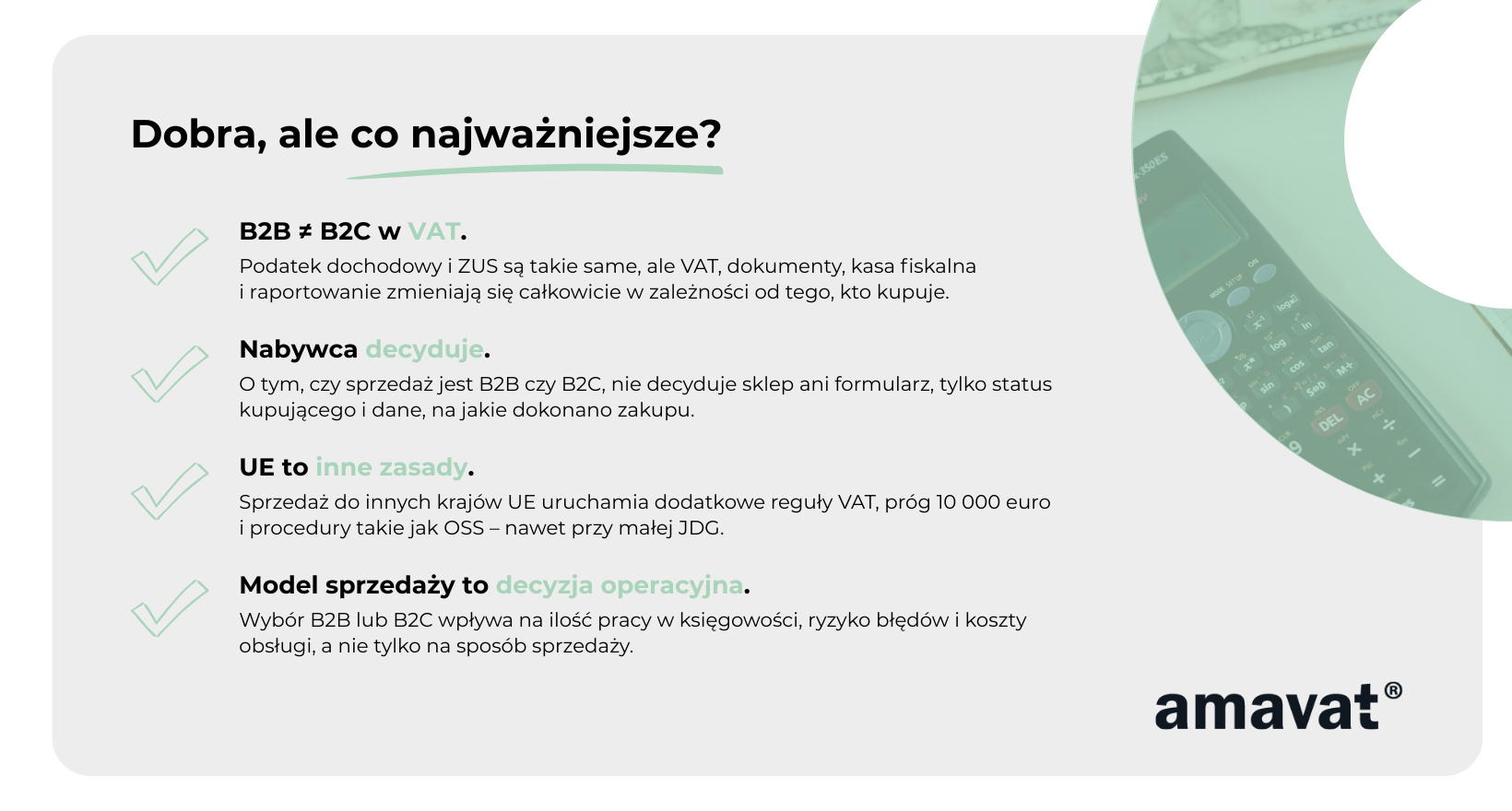 Na tym etapie warto podkreślić coś bardzo ważnego. Status VAT jest fundamentem, ale sam w sobie nie rozstrzyga jeszcze różnic między B2B a B2C. To, czy jesteś VAT-owcem, czy korzystasz ze zwolnienia, dotyczy Ciebie jako sprzedawcy. Rozróżnienie B2B i B2C zaczyna mieć realne znaczenie przy konkretnych transakcjach, zwłaszcza przy sprzedaży zagranicznej, ustalaniu miejsca opodatkowania czy późniejszym raportowaniu.