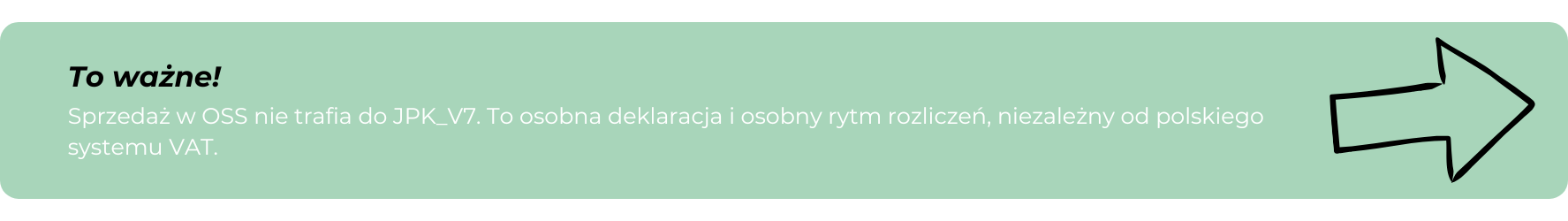Sytuacja zmienia się przy sprzedaży B2C do innych krajów Unii Europejskiej, która jest rozliczana w procedurze OSS. Sprzedaż taka nie jest wykazywana w JPK_V7 jako sprzedaż opodatkowana polskim VAT. Jest raportowana w osobnej deklaracji OSS, składanej kwartalnie.