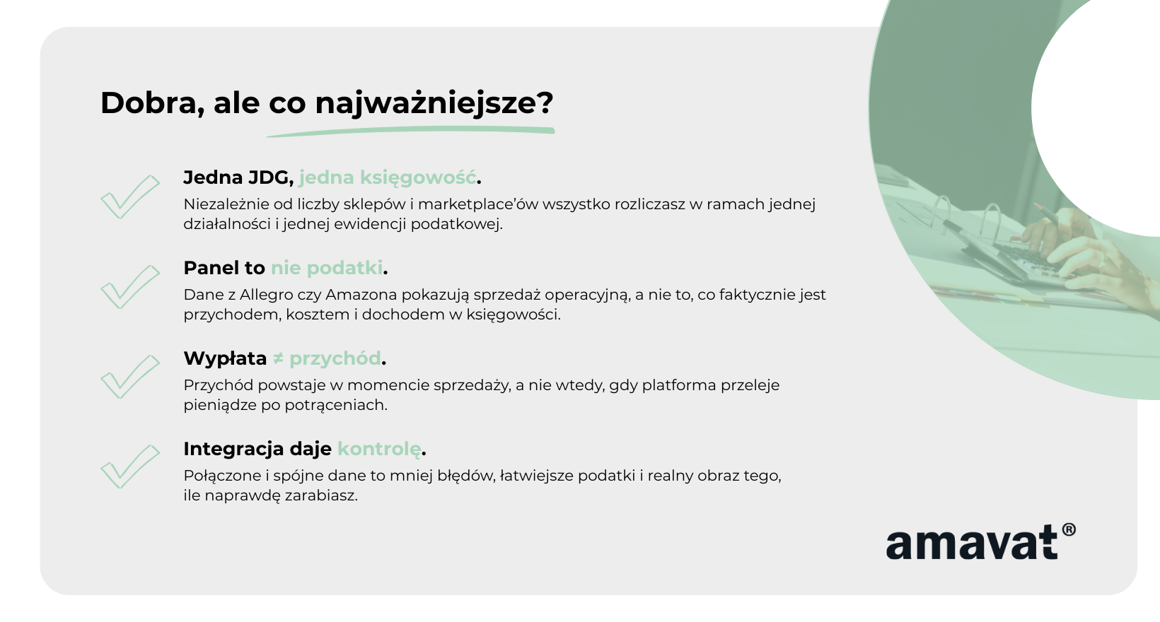 To ważne, bo na poziomie paneli sprzedażowych wszystko wygląda jak osobne „światy”. Masz osobne saldo na każdej platformie, osobne wypłaty i osobne raporty. Ale podatkowo to wciąż jedna księgowość jednoosobowej firmy, a nie kilka oddzielnych rozliczeń. Dla Ciebie jako właściciela JDG chodzi o to, żeby zebrać to w jedną, spójną całość i móc łatwo pokazać, skąd wzięły się liczby w rozliczeniach.