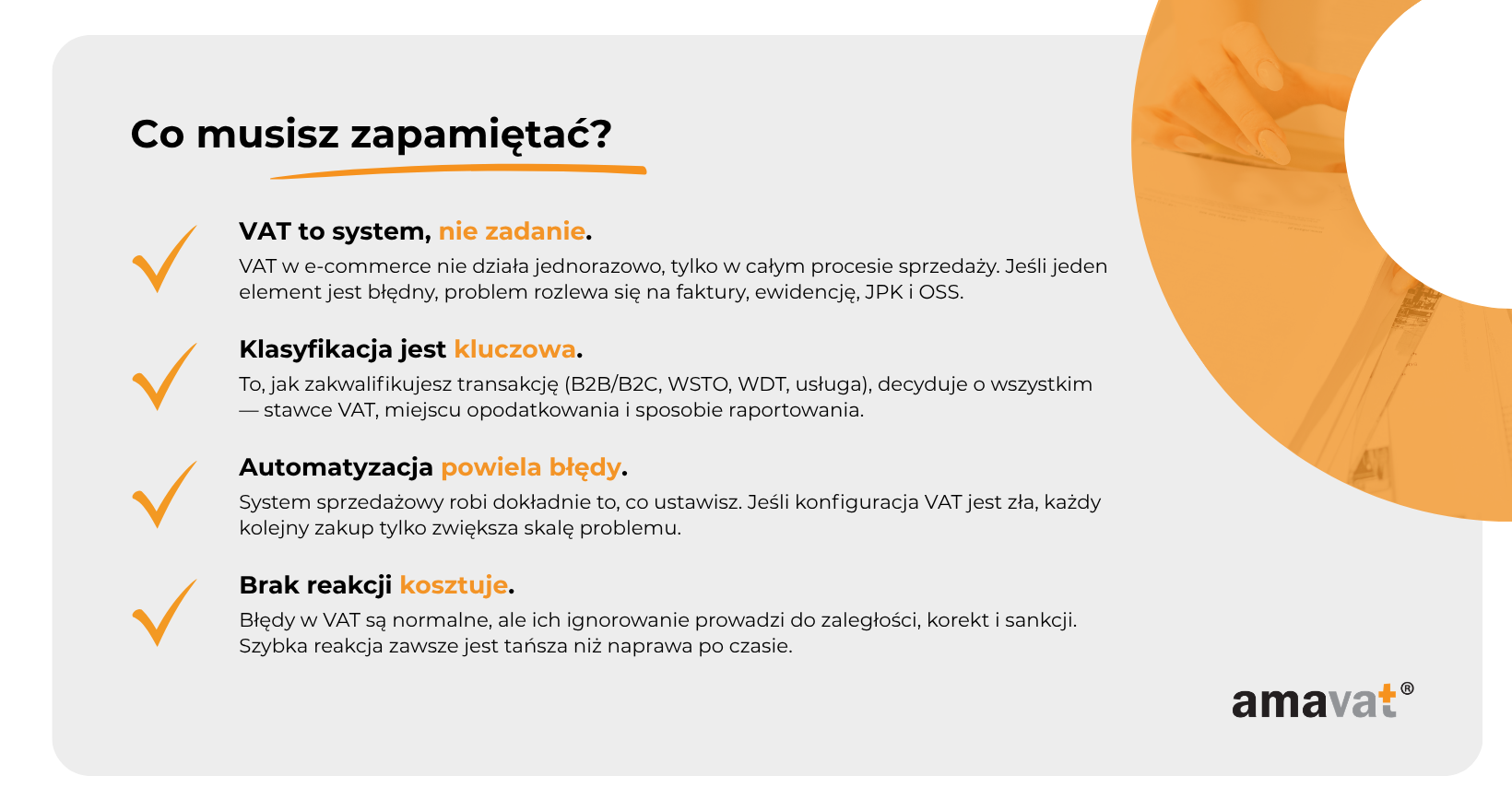 Największym problemem jest jednak złudne poczucie bezpieczeństwa. Przez długi czas nic się nie dzieje, sprzedaż rośnie, deklaracje są składane, a błędy pozostają niewidoczne. Do momentu, w którym trzeba się z nimi zmierzyć i wtedy okazuje się, że problem jest znacznie większy, niż się wydawało.