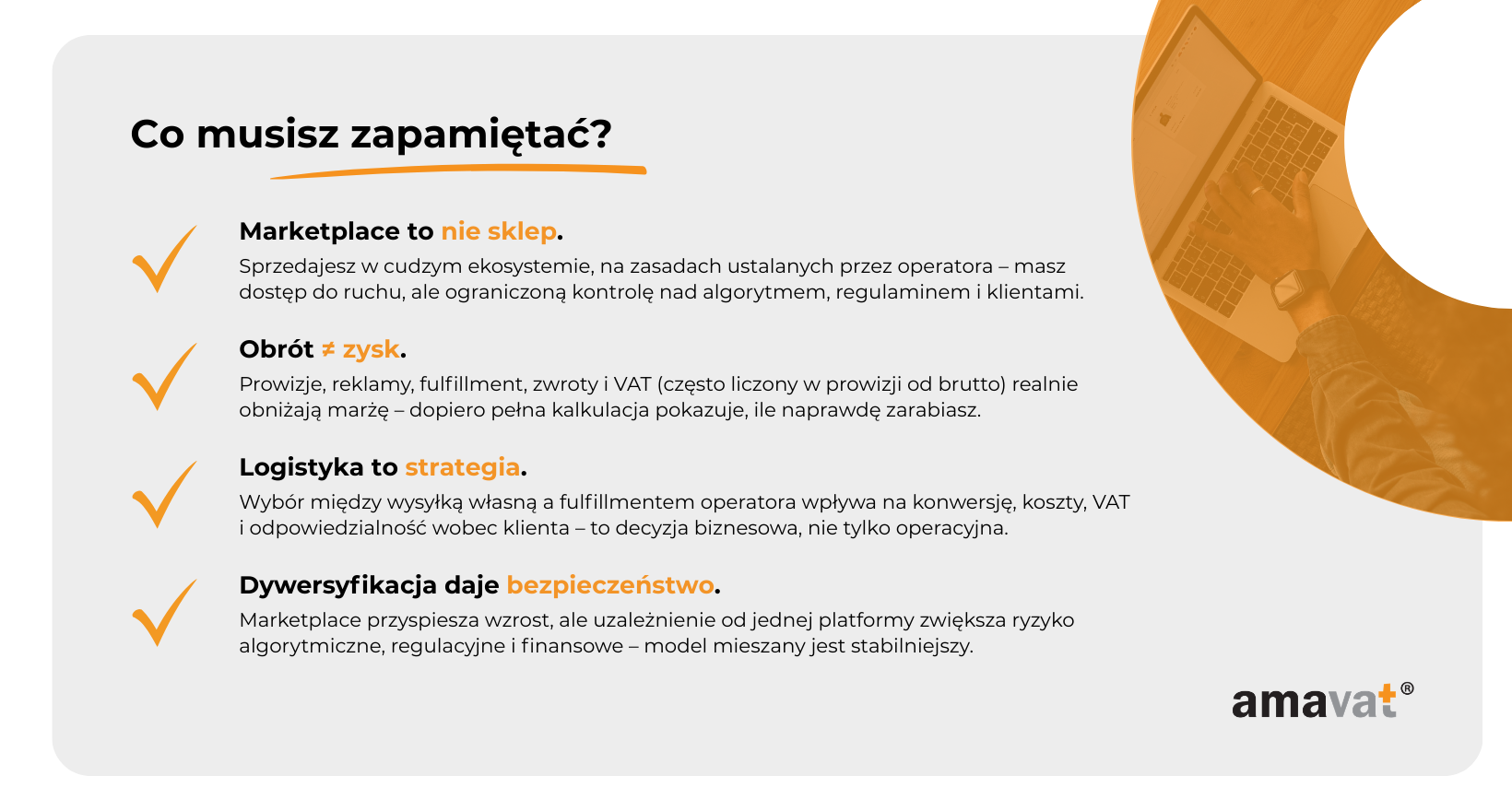 Model mieszany, łączący sprzedaż na marketplace z własnym sklepem internetowym, w praktyce okazuje się najbezpieczniejszym podejściem. Platforma generuje wolumen i dostęp do szerokiego rynku, natomiast sklep własny buduje marżę, relację z klientem i długoterminową wartość przedsiębiorstwa. Dywersyfikacja kanałów zmniejsza ryzyko algorytmiczne, regulacyjne i operacyjne, a jednocześnie zwiększa odporność firmy na nagłe zmiany warunków współpracy.