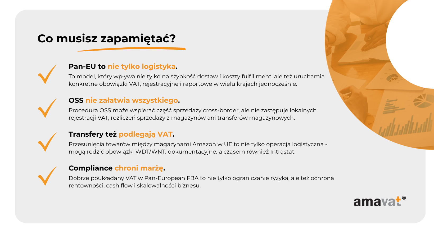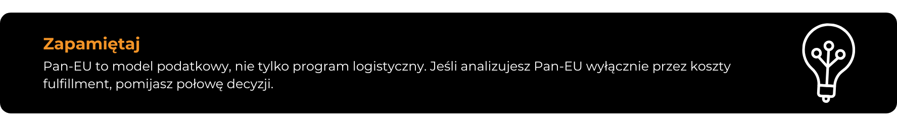 To bardzo ważne, bo wiele firm myli model Pan-EU z prostym eksportem na kilka marketplace’ów. Sama sprzedaż na Amazon.de czy Amazon.fr nie musi jeszcze oznaczać lokalnego VAT w tych krajach. Kluczowy jest moment, w którym towary zaczynają być tam fizycznie przechowywane. I to właśnie odróżnia zwykłą ekspansję sprzedażową od wejścia w model Pan-European.