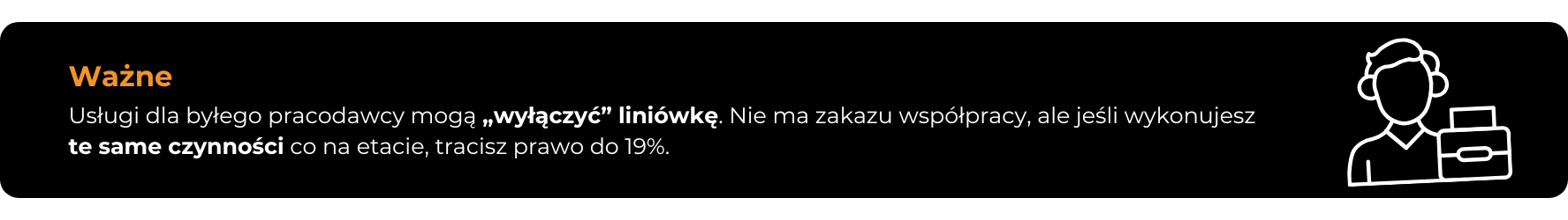 Najważniejszym ograniczeniem, o którym musi pamiętać każdy przedsiębiorca, jest przepis dotyczący usług świadczonych na rzecz byłego lub obecnego pracodawcy. Nie chodzi tutaj o zakaz współpracy sam w sobie, lecz o utratę prawa do podatku liniowego w sytuacji, gdy przedsiębiorca wykonuje w działalności te same czynności, które wykonywał wcześniej na podstawie umowy o pracę.