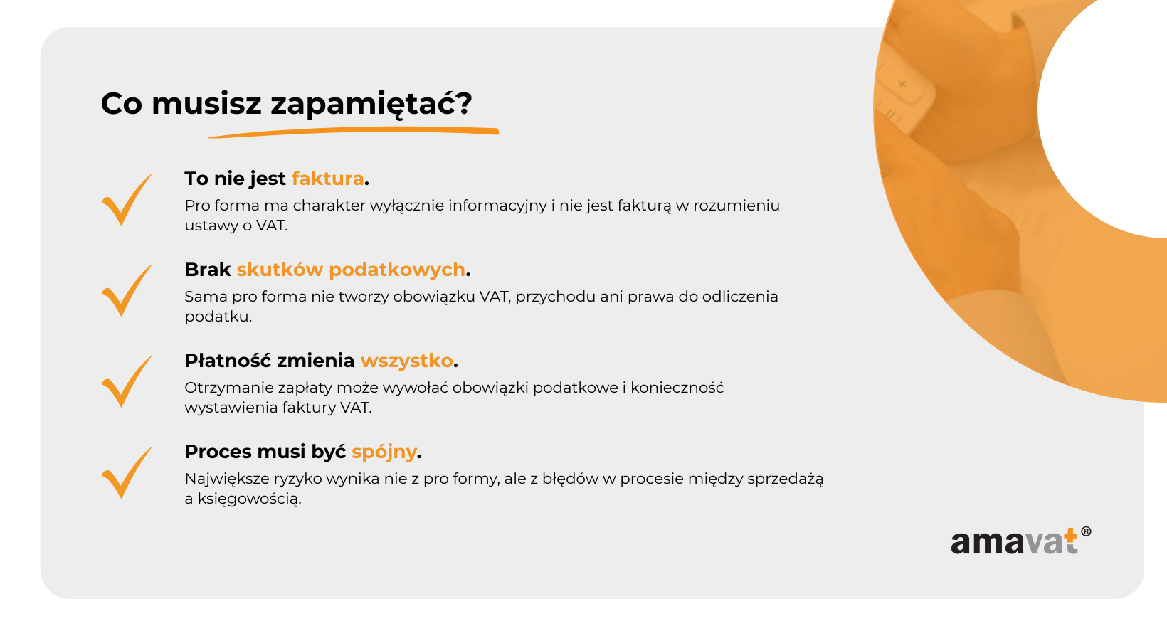 W praktyce warto zapamiętać jedną zasadę. Pro forma może uruchomić proces sprzedaży i doprowadzić do płatności, ale to faktura VAT decyduje o skutkach podatkowych.
