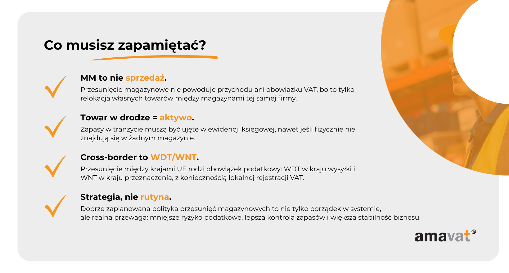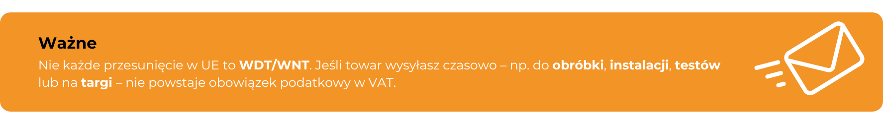 Warto pamiętać o wyjątkach. Nie każde przemieszczenie generuje WDT/WNT. Jeśli wysyłasz towar tymczasowo, np. do obróbki, montażu, testów, na targi lub do świadczenia usług i towar wraca do kraju wysyłki, nie rozpoznajesz dostawy. Osobny, szczególny reżim dotyczy magazynów typu call-off stock: gdy towar trafia do innego państwa z przeznaczeniem dla znanego odbiorcy i pozostaje w magazynie do czasu jego pobrania, WDT powstaje dopiero w chwili pobrania towaru przez tego odbiorcę.