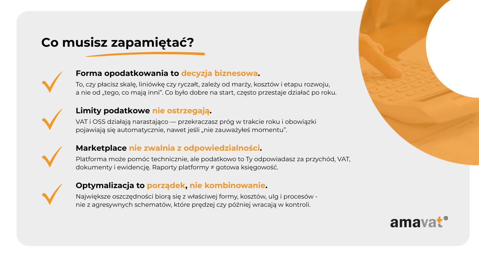 W praktyce oznacza to jedno. Sprzedaż na marketplace wymusza większą dyscyplinę podatkową od samego początku. Nie ma tu miejsca na działanie „na próbę” ani na liczenie, że niewielkie nieścisłości pozostaną niezauważone.