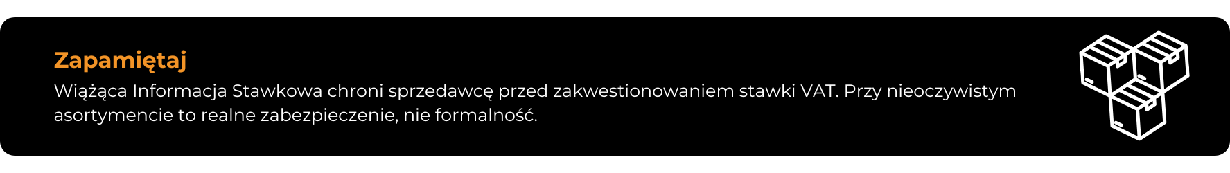 Źródłem wielu takich problemów jest błędna klasyfikacja towarów. Granice między stawkami bywają nieintuicyjne, zwłaszcza przy produktach cyfrowych, zestawach lub sprzedaży „pakietowej”. Jeżeli masz wątpliwości co do właściwej stawki, realnym zabezpieczeniem jest wiążąca informacja stawkowa. WIS pozwala potwierdzić stawkę i daje ochronę w razie późniejszej kontroli, zamiast opierać się na domysłach.