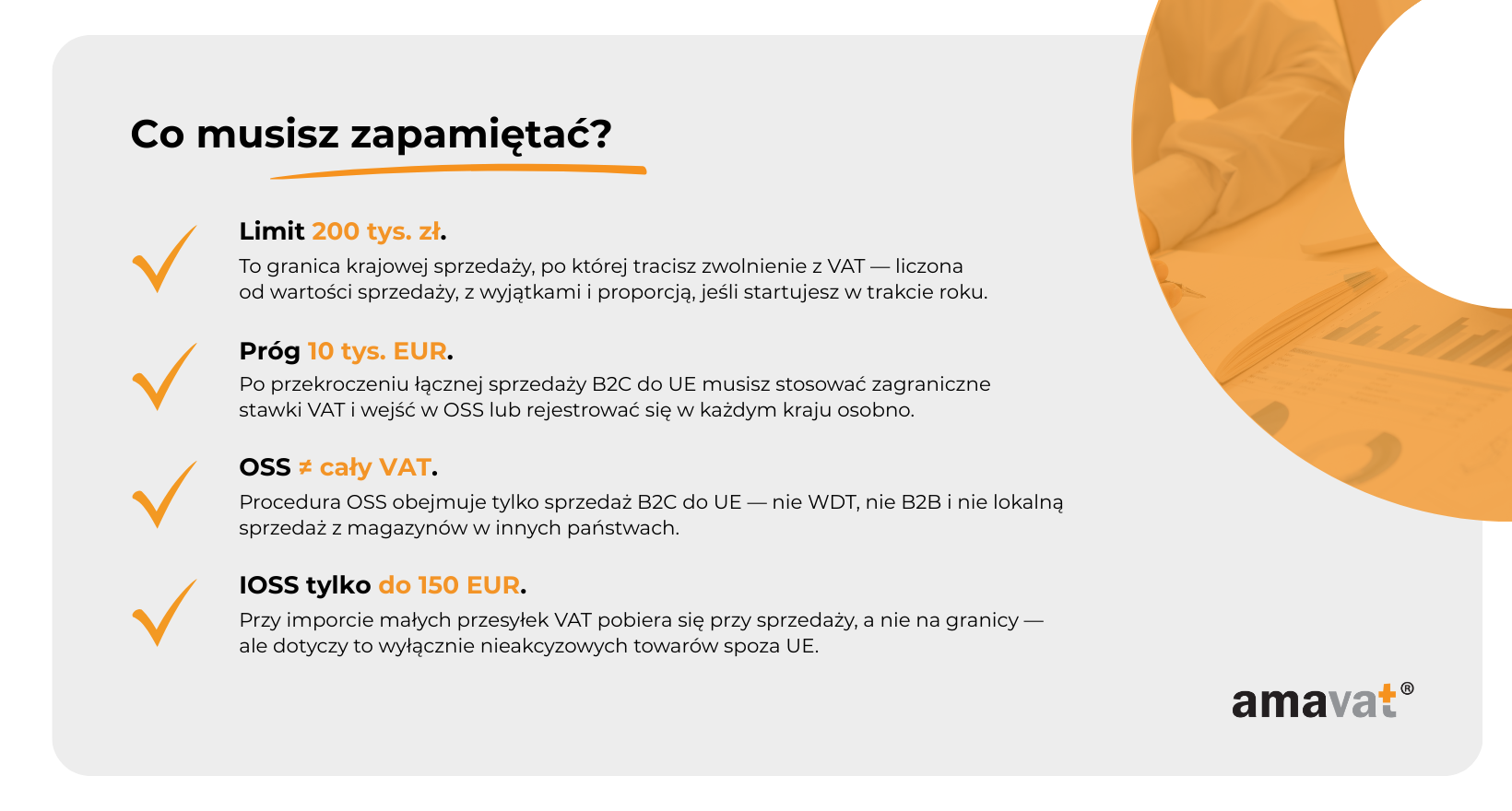 Najważniejszym punktem odniesienia pozostają dwa limity. Pierwszy to dwieście tysięcy złotych krajowej sprzedaży zwolnionej, po którego przekroczeniu przedsiębiorca traci prawo do zwolnienia podmiotowego i musi wejść w pełny system VAT. Drugi to dziesięć tysięcy euro łącznej sprzedaży wysyłkowej do konsumentów w całej Unii, od którego zależy, czy sprzedaż kwalifikowana jako WSTO będzie opodatkowana według polskich, czy zagranicznych stawek VAT. Te dwa progi działają równolegle i nie wpływają na siebie, dlatego młody przedsiębiorca musi od początku prowadzić ewidencję, która pozwoli ocenić sytuację w obu obszarach jednocześnie.
