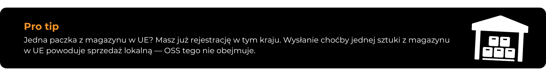 Ważne jest jednak to, że ten wyjątek działa tylko wtedy, gdy wysyłasz towary wyłącznie z jednego kraju. Jeśli korzystasz z magazynów w innych państwach UE, tracisz możliwość stosowania polskich zasad nawet przed przekroczeniem limitu. W takim przypadku sprzedaż z magazynu lokalnego jest traktowana jako sprzedaż krajowa w państwie położenia tego magazynu, co oznacza obowiązek rejestracji do tamtejszego VAT.