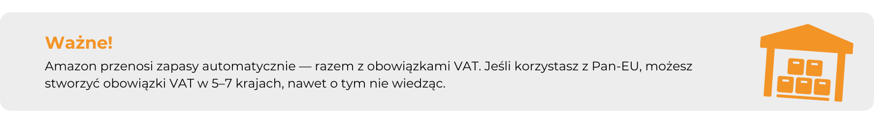 Scenariusz zmienia się radykalnie, gdy zaczynasz korzystać z magazynów za granicą. Jeśli decydujesz się na Amazon FBA w Niemczech, automatycznie wchodzisz w rejestrację VAT DE, ponieważ magazynowanie tworzy lokalną sprzedaż. Gdy korzystasz z FBA Pan-EU i Amazon przerzuca Twoje zapasy między krajami, tworzysz obowiązki rejestracji w kilku państwach naraz. OSS staje się wtedy dodatkowym narzędziem jedynie dla tej sprzedaży, która nadal wychodzi z Polski, ale nie obejmuje sprzedaży realizowanej z zagranicznych magazynów.