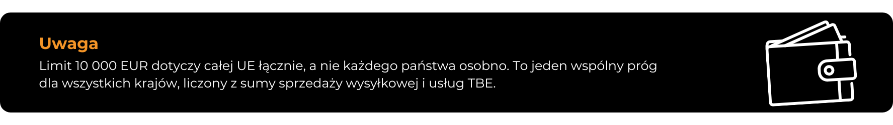 Drugi kluczowy scenariusz to sprzedaż wysyłkowa B2C do klientów w innych krajach UE. Do poziomu 10 000 EUR rocznie (liczonych łącznie dla całej UE, a nie osobno dla każdego państwa) możesz rozliczać VAT w Polsce. On jest wtedy „domyślnym” miejscem opodatkowania Twojej sprzedaży. Ale kiedy przekroczysz ten limit, zasady się zmieniają: miejscem opodatkowania staje się kraj konsumenta.