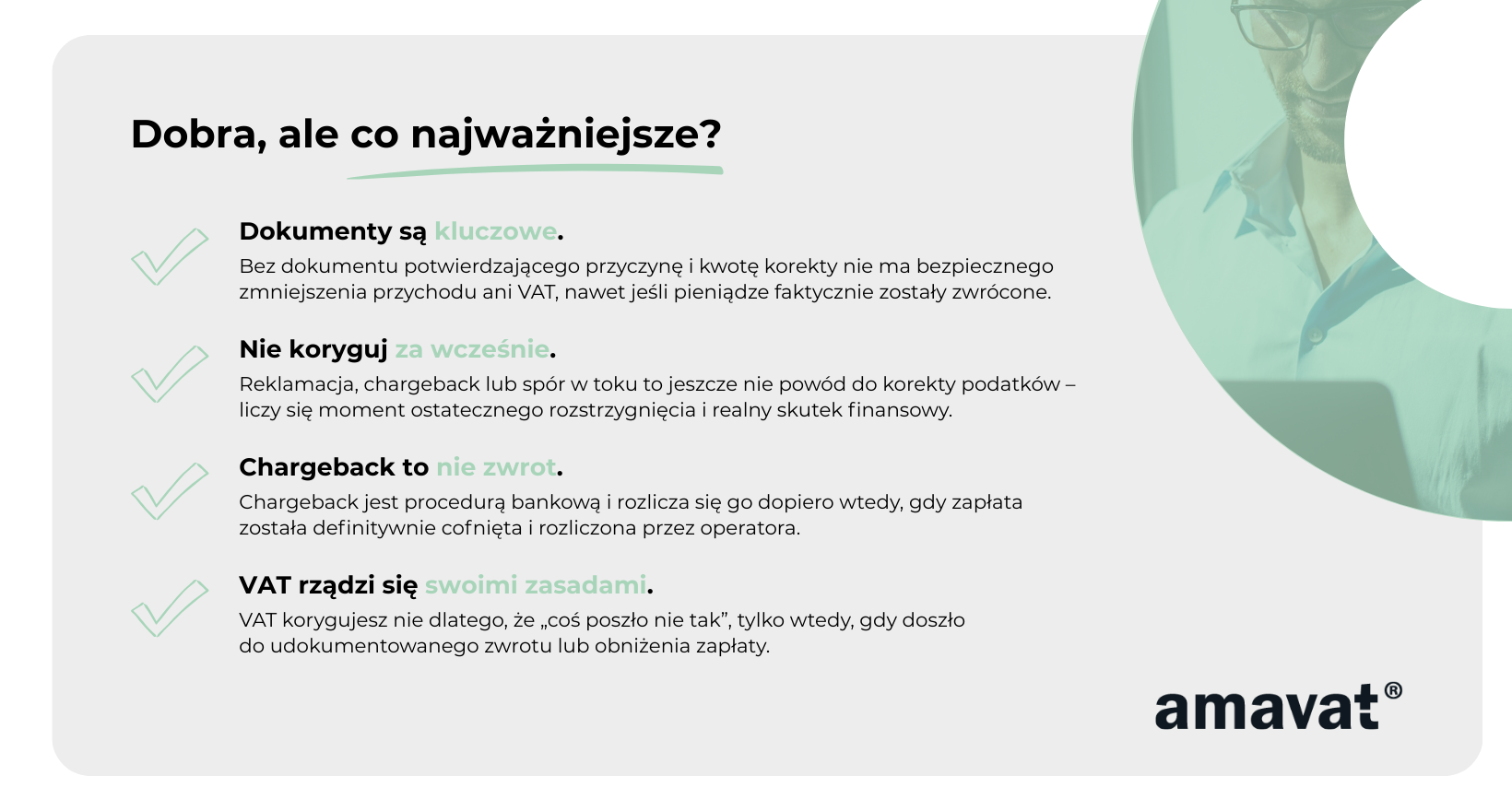 Jeżeli przedsiębiorca jest vatowcem, pojawia się jeszcze kwestia VAT. Korekta VAT przy chargebacku nie wynika automatycznie z ruchu na rachunku bankowym. Chargeback sam w sobie nie jest instytucją z ustawy o VAT, ale w praktyce może stanowić dowód zwrotu zapłaty, jeżeli jednoznacznie wynika z niego, że sprzedaż została anulowana. Kluczowe jest więc to, czy dokumenty pokazują faktyczne cofnięcie zapłaty, a nie tylko techniczny etap sporu.