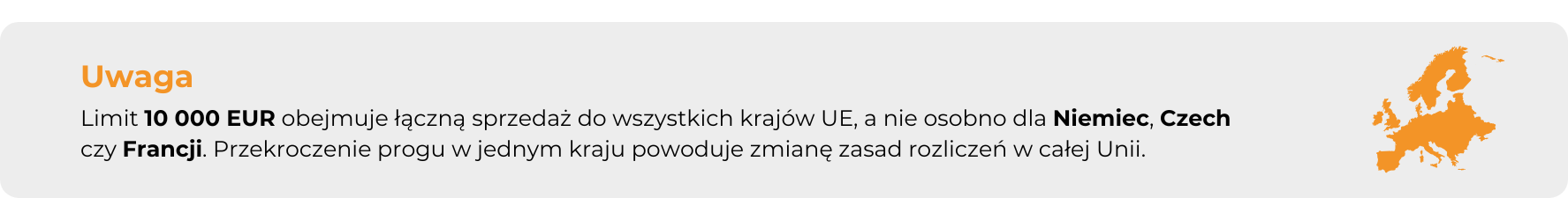 Limit ten, określony w art. 59c Dyrektywy VAT (2006/112/WE), obejmuje łączną wartość sprzedaży B2C do wszystkich krajów Unii, liczoną bez VAT. Nie jest to próg „na każdy kraj”, lecz wspólny dla całej UE. Jeśli całkowita wartość sprzedaży w bieżącym i poprzednim roku podatkowym przekroczy 10 000 euro, miejscem opodatkowania staje się państwo konsumpcji, czyli kraj, w którym znajduje się klient.