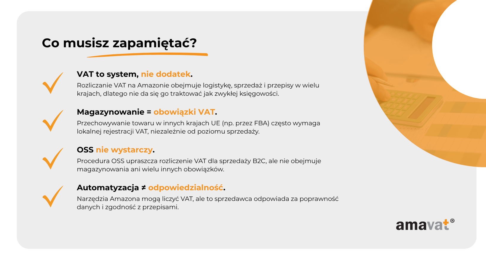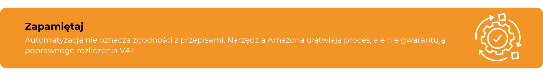 Najważniejsze jest to, że automatyzacja nie przenosi odpowiedzialności. Amazon może wyliczać VAT na podstawie dostępnych informacji, ale to sprzedawca odpowiada za ich poprawność i zgodność z przepisami. W praktyce oznacza to, że VCS jest wsparciem dla rozliczenia VAT, a nie jego zamiennikiem.