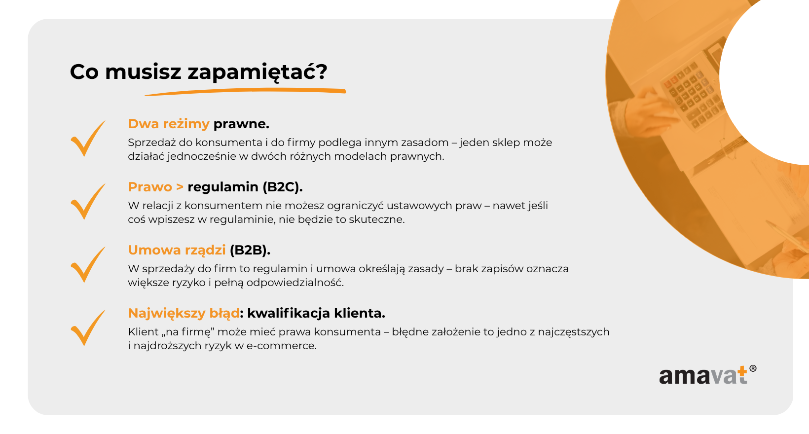Jednym z najważniejszych wniosków jest to, że w praktyce prowadzisz jeden sklep, ale działasz w dwóch równoległych reżimach prawnych. Różnią się one nie tylko szczegółami, ale całym podejściem do relacji z klientem i odpowiedzialności sprzedawcy.
