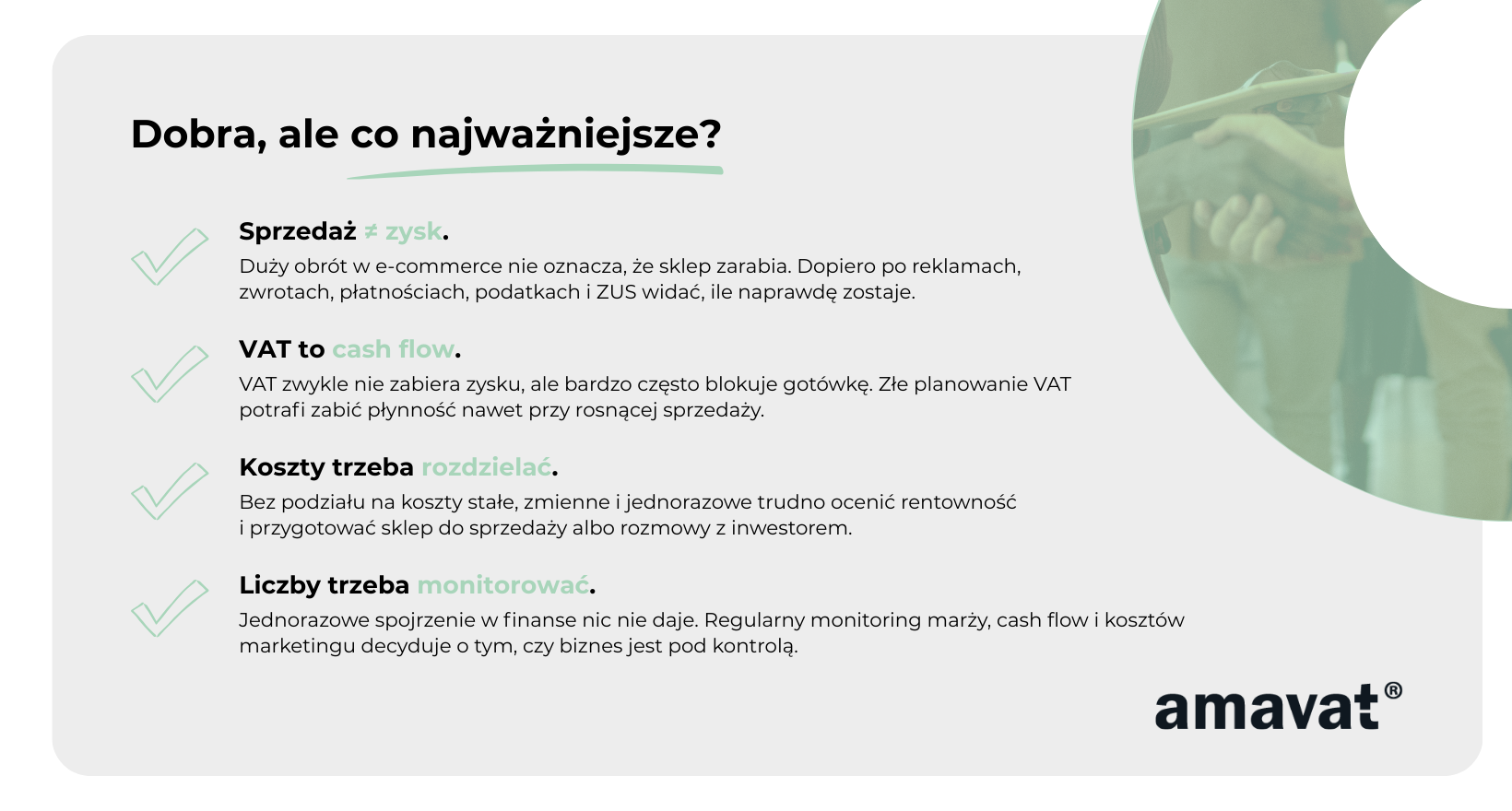 Jednym z najczęstszych problemów w e-commerce, zwłaszcza w jednoosobowej działalności gospodarczej, jest iluzja rentowności. Sklep sprzedaje coraz więcej, pieniądze wpływają na konto firmowe, a mimo to po opłaceniu wszystkiego okazuje się, że realnego zysku prawie nie ma. Bardzo często wynika to z mylenia obrotu z faktycznym zarobkiem albo z sytuacji, w której wynik księgowy wygląda dobrze, ale gotówka znika przez zapasy, zwroty i wydatki ponoszone z wyprzedzeniem.