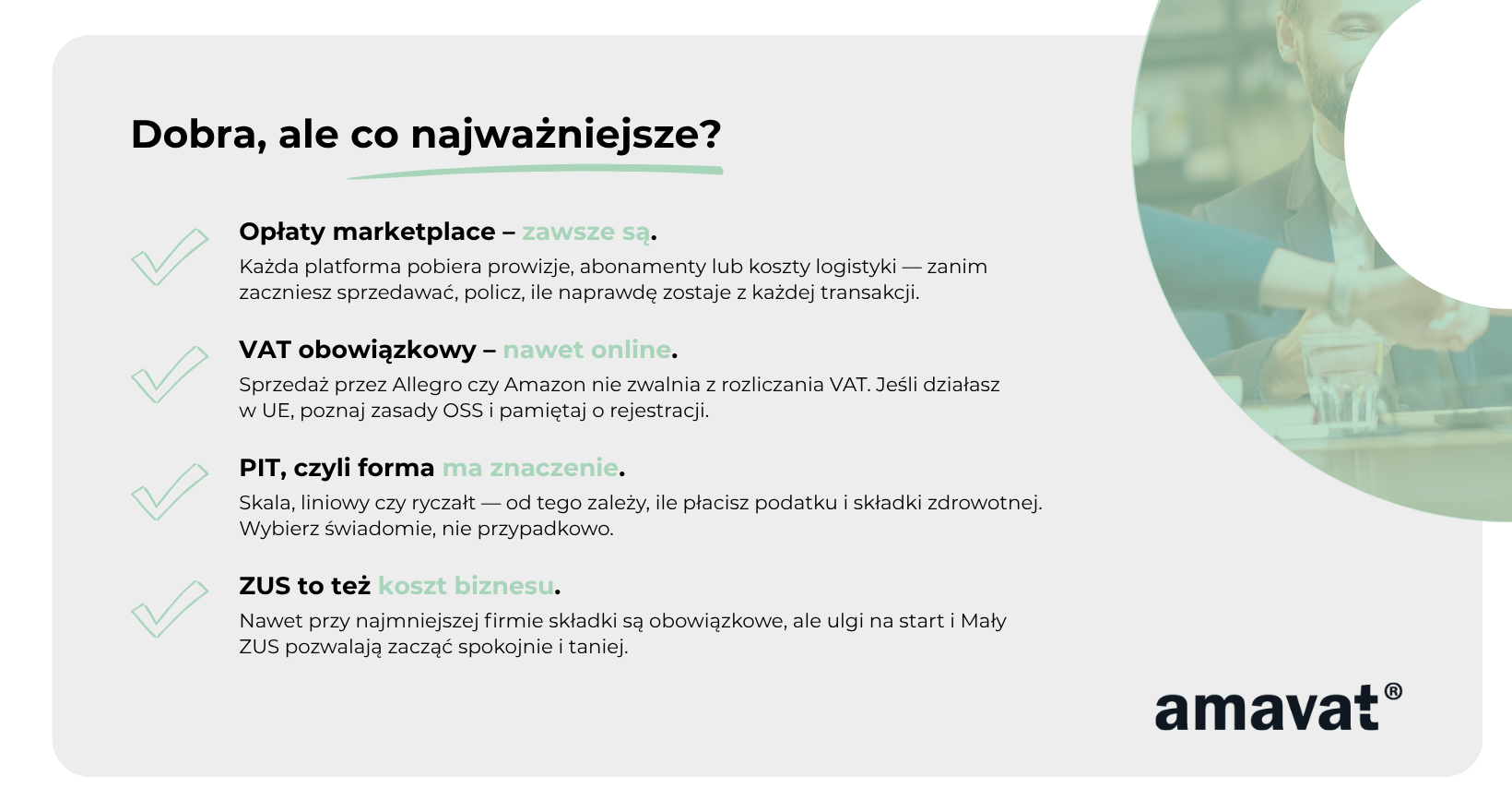 W tym artykule postaramy się to wszystko uporządkować. Nie będzie tu trudnych definicji ani skomplikowanej terminologii podatkowej. Zamiast tego znajdziesz proste, zrozumiałe wyjaśnienia: co to jest VAT w JDG i kiedy musisz go płacić, czym różni się podatek liniowy od ryczałtu, jak wygląda kwestia kwoty wolnej od podatku, jakie składki ZUS czekają Cię na początku i później oraz na co przygotować się przy sprzedaży na marketplace’ach. Celem jest jasna odpowiedź na jedno pytanie: za co faktycznie musisz płacić prowadząc sprzedaż online w jednoosobowej działalności gospodarczej.