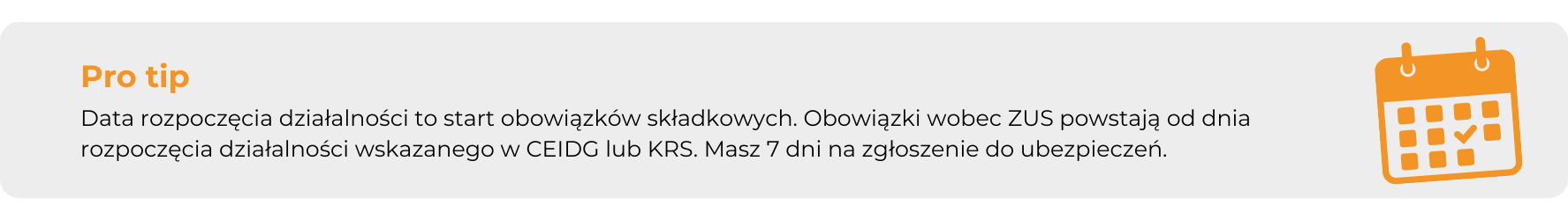 Po rozpoczęciu działalności gospodarczej masz obowiązek zgłosić się do odpowiednich ubezpieczeń w terminie siedmiu dni od dnia powstania obowiązku ubezpieczenia. Najczęściej będzie to data rozpoczęcia działalności wskazana w CEIDG albo w KRS.
